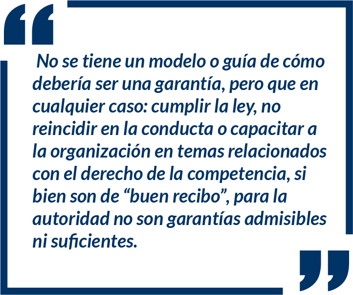 Frente a las garantías, el Superintendente dijo que “los programas de delación son muy valiosos para toda autoridad regulatoria”, enfatizando que en realidad no se tiene un modelo o guía de cómo debería ser una garantía, pero que en cualquier caso: cumplir la ley, no reincidir en la conducta o capacitar a la organización en temas relacionados con el derecho de la competencia, si bien son de “buen recibo”, para la autoridad no son garantías admisibles ni suficientes.